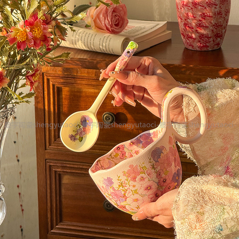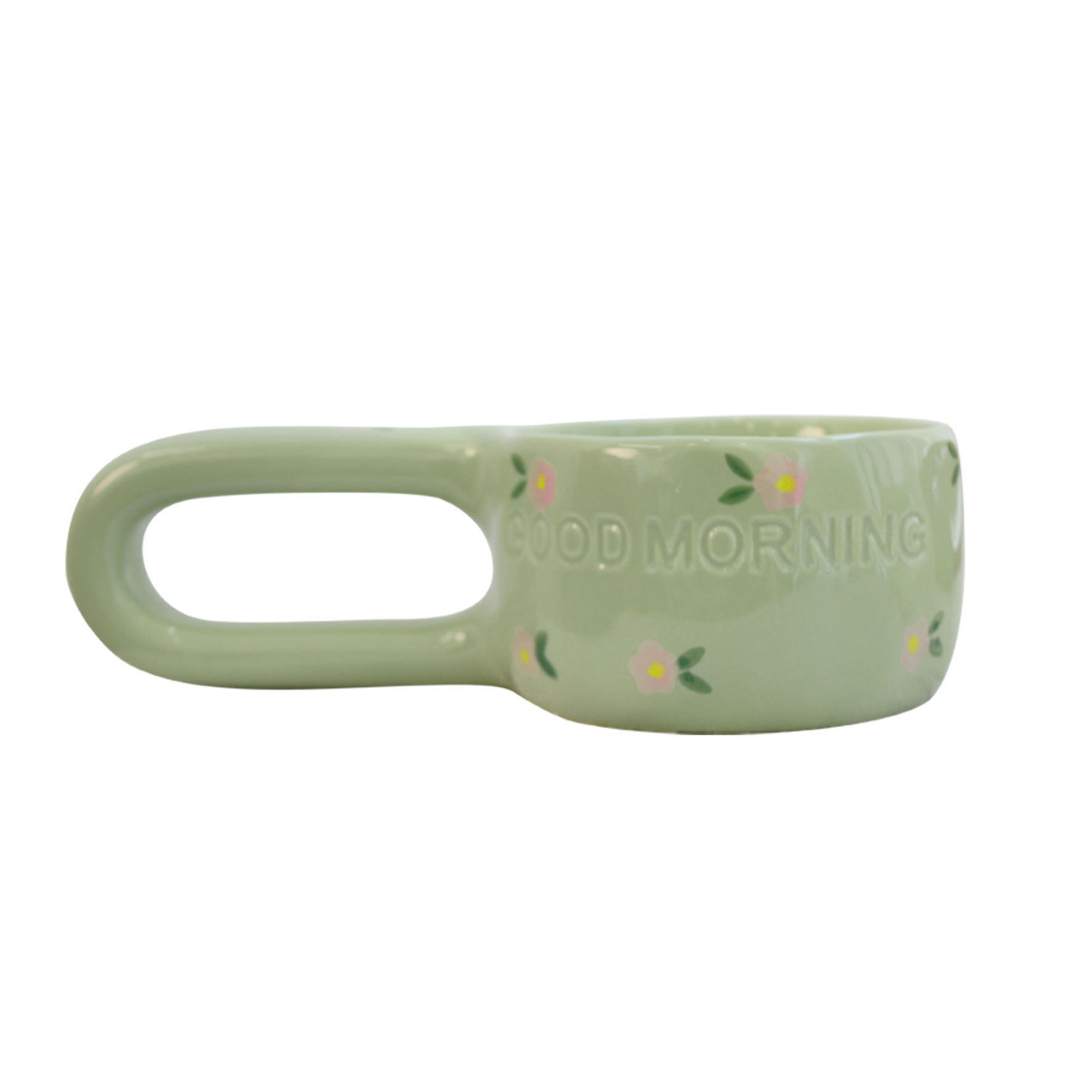 This ceramic mug features a vibrant floral pattern, a unique loop handle, and a scalloped rim. It’s perfect for enjoying your favorite beverages in style. Multiple styles are available to choose from.